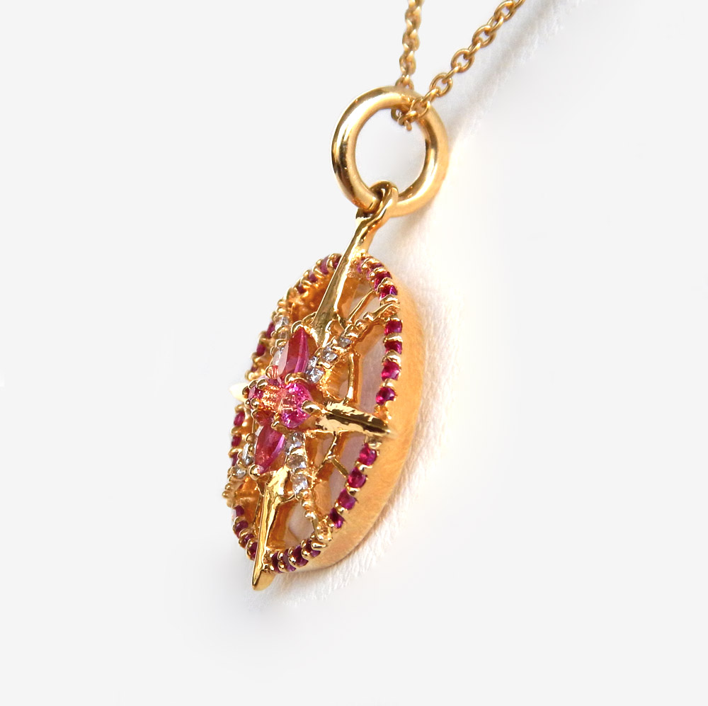 Navigate your way to elegance with this stunning ruby and diamond compass necklace. Representing guidance, adventure, and exploration, this necklace would be perfect for any globetrotter.