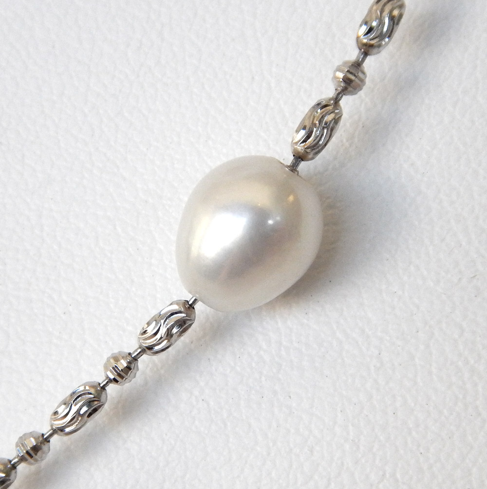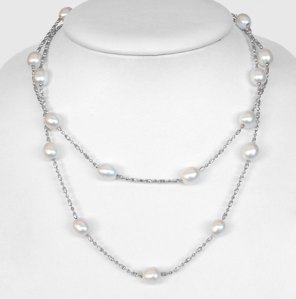 close up view of sterling silver freshwater pearl station necklacelong pearl station necklace on model