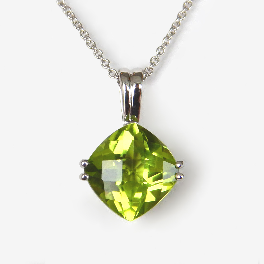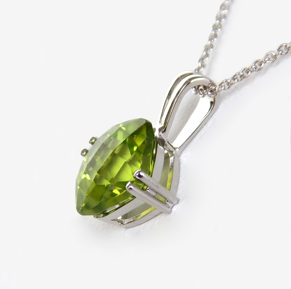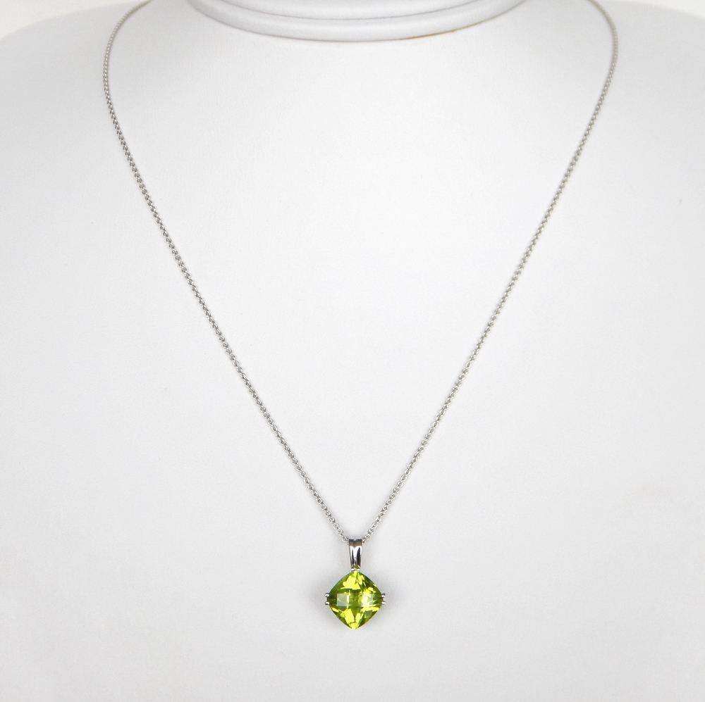 side view of white gold peridot pendantwhite gold peridot pendant on chainwhite gold peridot pendant on model