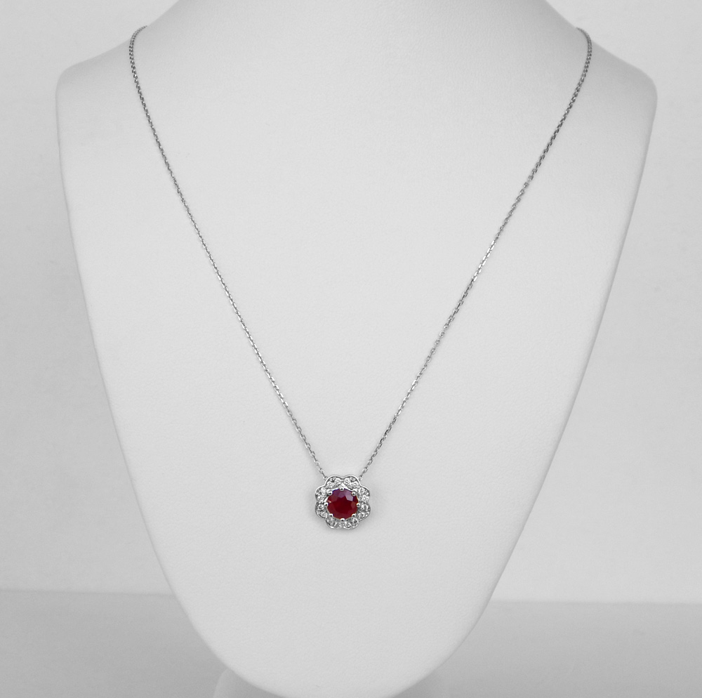 This mesmerizing necklace features a gorgeous, bright red ruby surrounded by a cluster of diamonds.