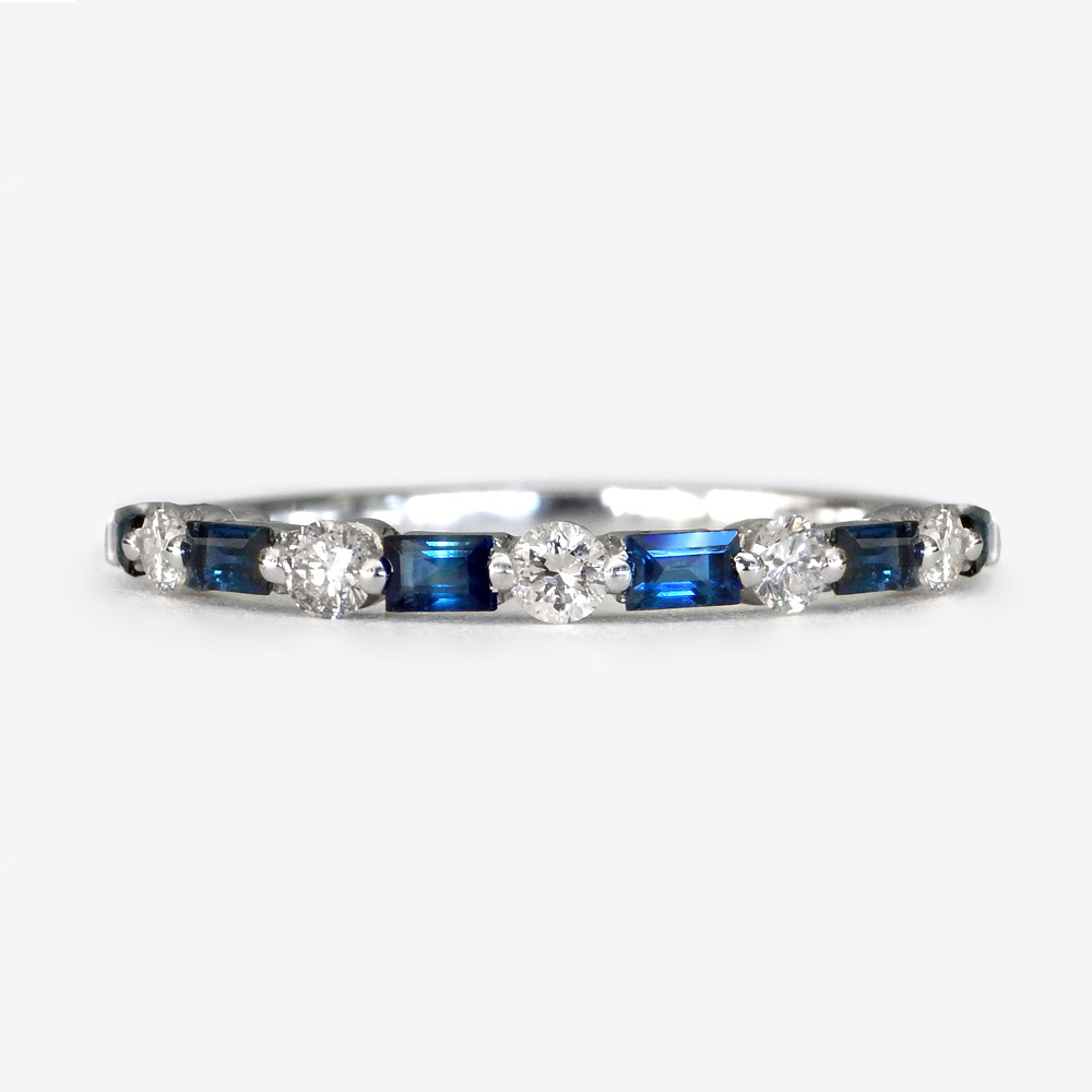 Elegant and distinctive, this band pairs the cool brilliance of white gold with the striking contrast of baguette sapphires and round, sparkling diamonds.