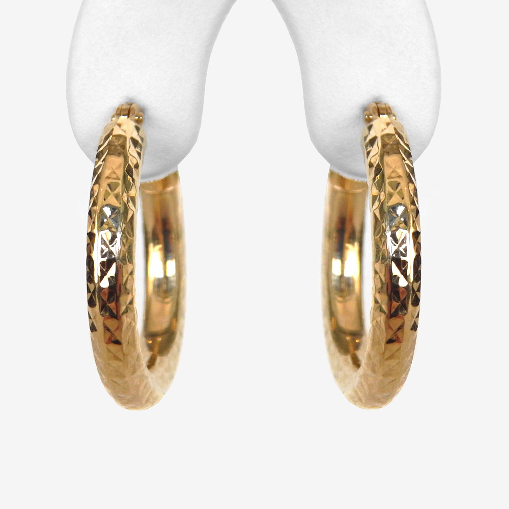 Crafted in yellow gold, these hoops feature a unique diamond-cut texture that catches and reflects light, creating a subtle sparkle with every movement.